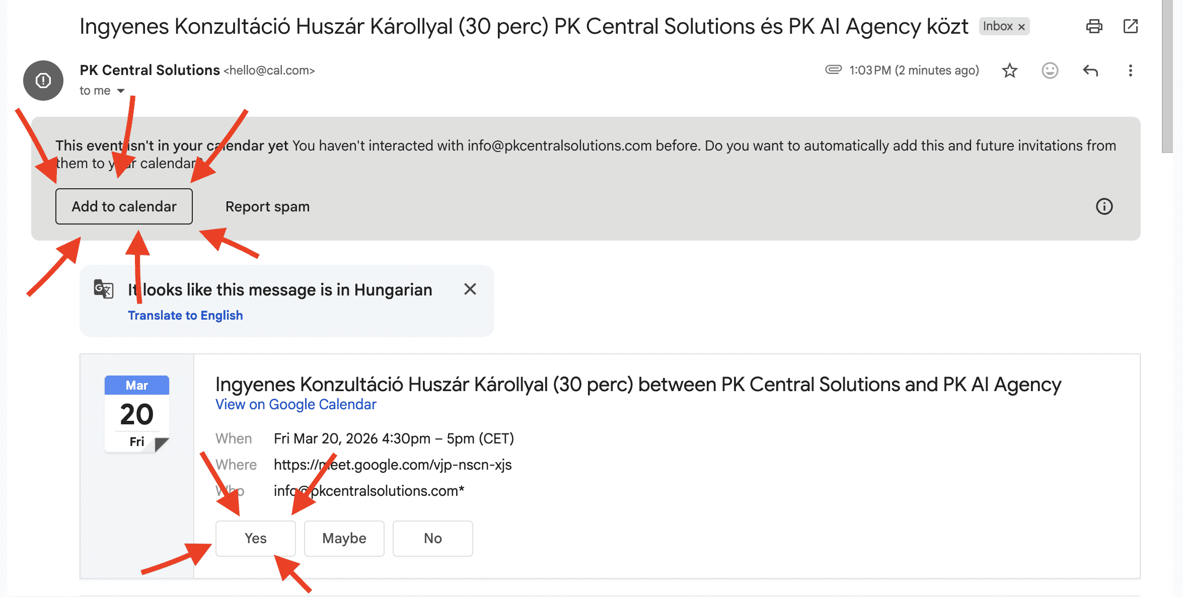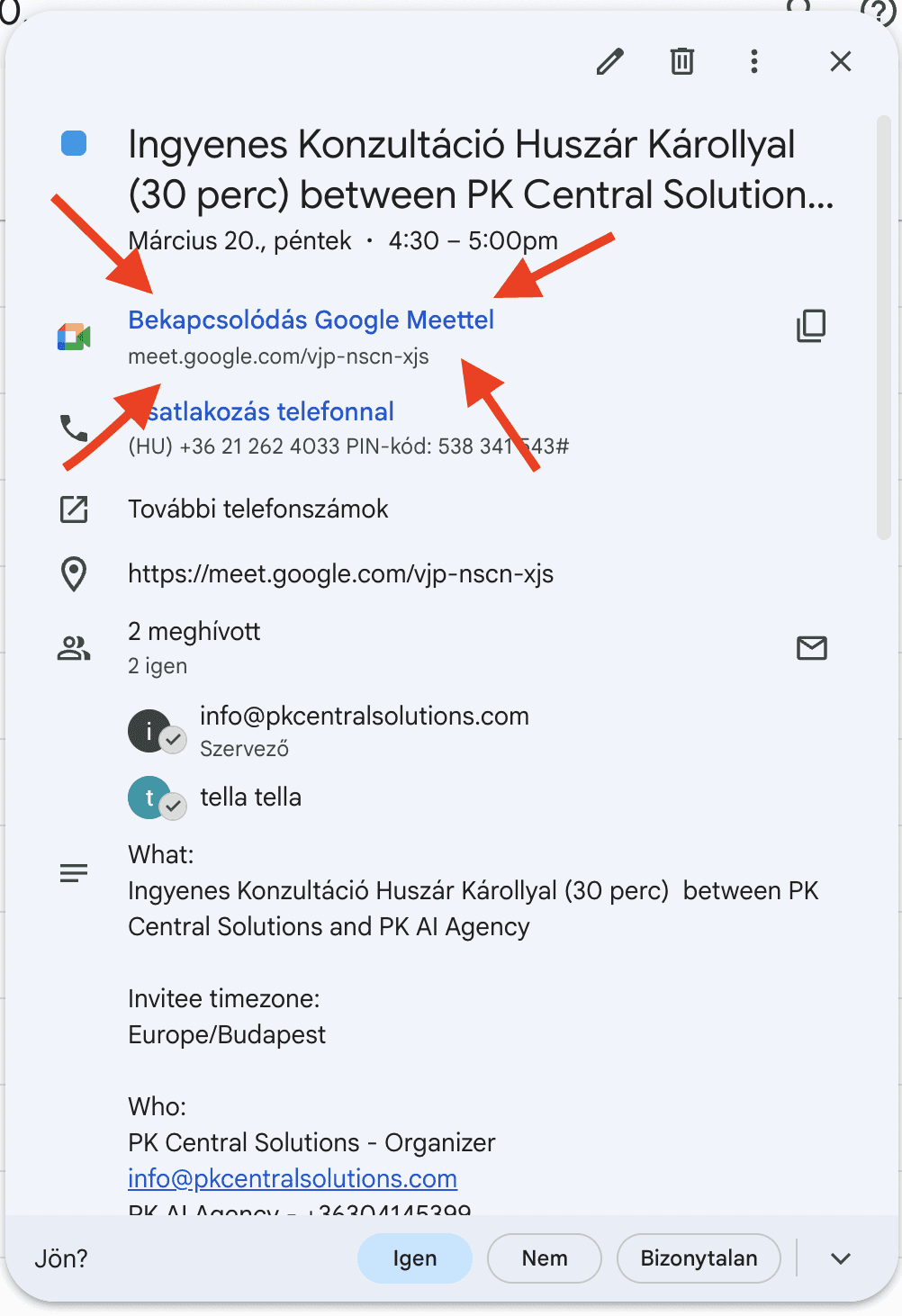 Megnyitod a naptáradat, rámész az eseményre, és a „Bekapcsolódás Google Meettel" gombra kattintasz.
